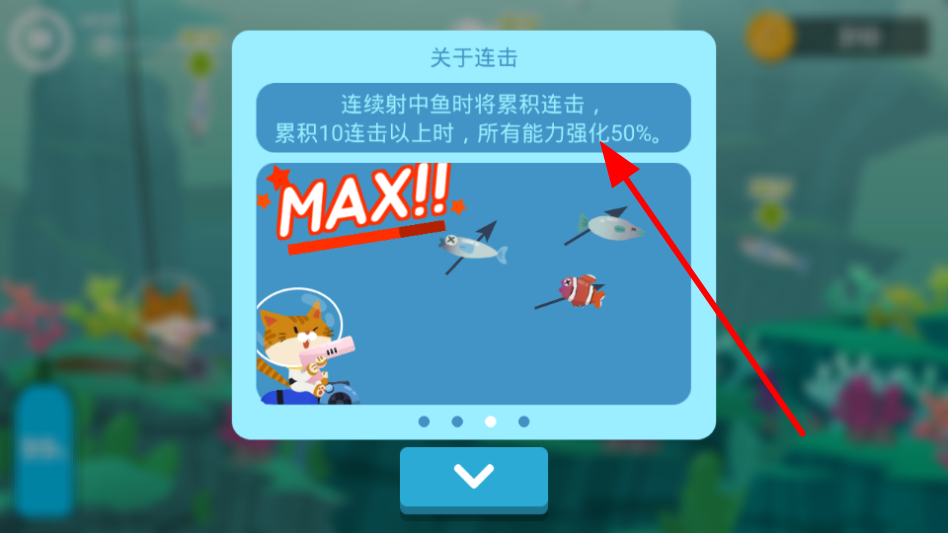 2、捕魚過程中連續(xù)射中魚可以累積連擊數(shù),當(dāng)連擊數(shù)累積到10次以上時(shí),所有能力都會(huì)強(qiáng)化50%。