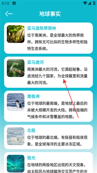 2、在地球事實列表頁面,選擇亞馬遜河,進入亞馬遜河詳情頁面。