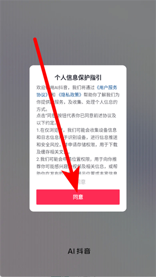 1、打開抖音ai人工智能,在彈出的窗口中,點擊紅色的同意按鈕。
