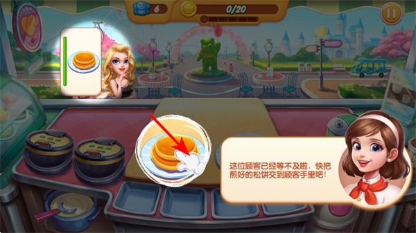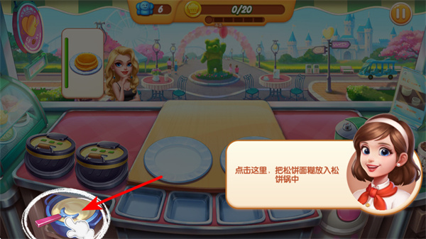 3、點(diǎn)擊松餅面糊區(qū)域,將松餅面糊放入松餅鍋中,這是制作松餅的關(guān)鍵步驟,需準(zhǔn)確操作來升級(jí)。