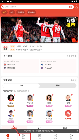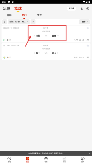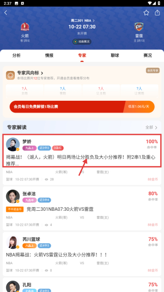 4、在賽事詳情頁面,查看專家解讀,如羅嬌的分析火箭前兩日兩場讓分勝負及大小分推薦!附2串1及重心推薦,可根據(jù)專家建議了解賽事分析。