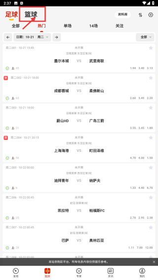 2、在足籃賽事頁面,點擊籃球選項,進入籃球賽事列表。