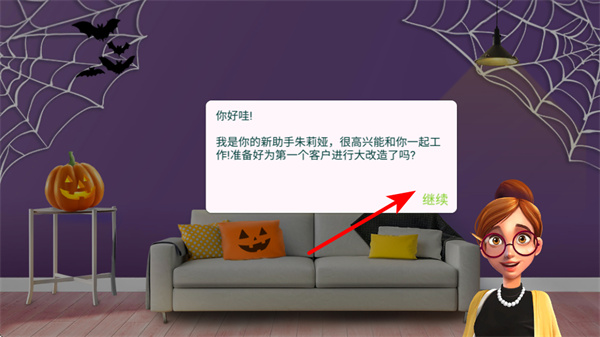 1、點(diǎn)擊繼續(xù)按鈕,可推進(jìn)游戲劇情,開啟為第一個(gè)客戶進(jìn)行房屋改造的任務(wù),逐步開展裝修工作。