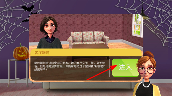 2、在客廳難題界面,點(diǎn)擊進(jìn)入按鈕,可承接客戶的裝修任務(wù),根據(jù)客戶需求和預(yù)算進(jìn)行客廳改造。
