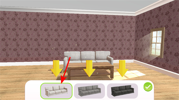 4、在家具選擇界面,可選擇不同款式的沙發(fā),如淺灰、深灰、黑色等,根據(jù)裝修風(fēng)格選擇合適的沙發(fā)。