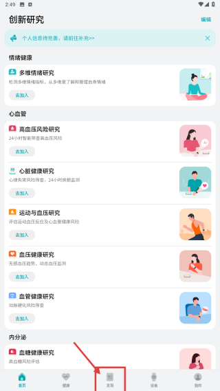 1、打開(kāi)健康研究類(lèi)應(yīng)用,點(diǎn)擊底部發(fā)現(xiàn)選項(xiàng),進(jìn)入發(fā)現(xiàn)頁(yè)面。