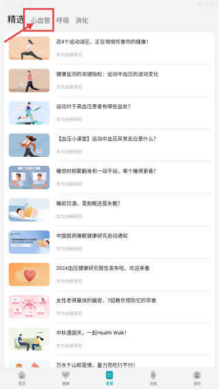 2、在發(fā)現(xiàn)頁(yè)面,點(diǎn)擊心血管選項(xiàng),進(jìn)入心血管健康研究?jī)?nèi)容列表。