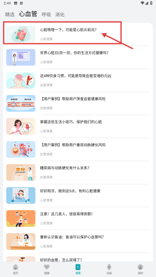 3、在心血管健康研究?jī)?nèi)容列表中,選擇感興趣的文章,例如心臟咯噔一下,可能是心肌炎前兆?點(diǎn)擊進(jìn)入文章詳情頁(yè)面。