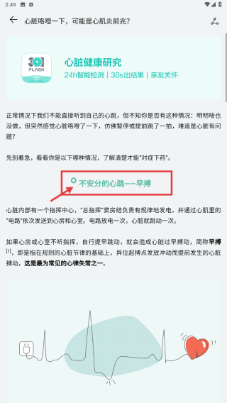 4、在文章詳情頁(yè)面,查看關(guān)于心臟早搏的知識(shí),如不安分的心跳--早搏,了解心臟早搏的成因等健康知識(shí),可幫助用戶關(guān)注心血管健康。