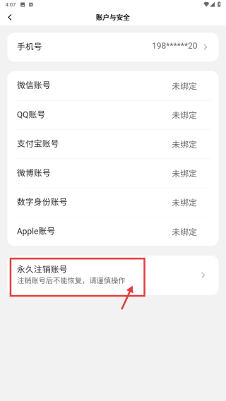 4、在賬戶與安全頁面,點擊永久注銷賬號選項,即可進行賬號注銷操作,需注意注銷后賬號不能恢復,請謹慎操作。