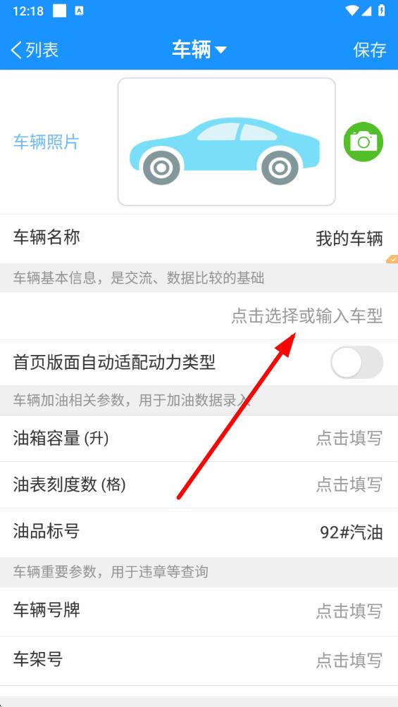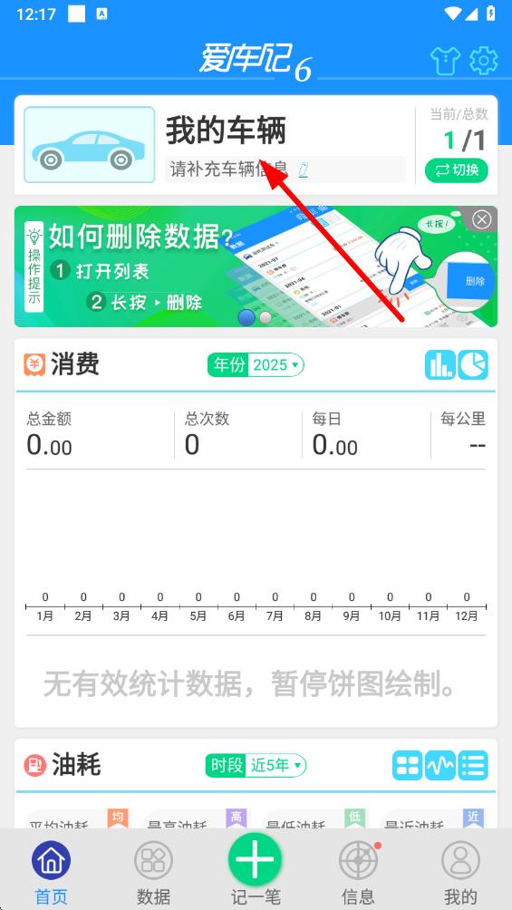 1、打開愛車記油耗版app,在首頁(yè)點(diǎn)擊我的車輛區(qū)域,進(jìn)入車輛信息補(bǔ)充頁(yè)面。