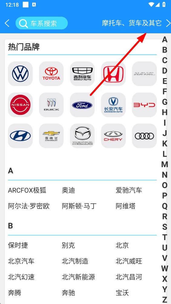 3、在車系搜索界面,點(diǎn)擊右上角摩托車、貨車及其它選項(xiàng),進(jìn)入車輛類型選擇頁(yè)面。