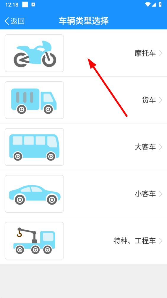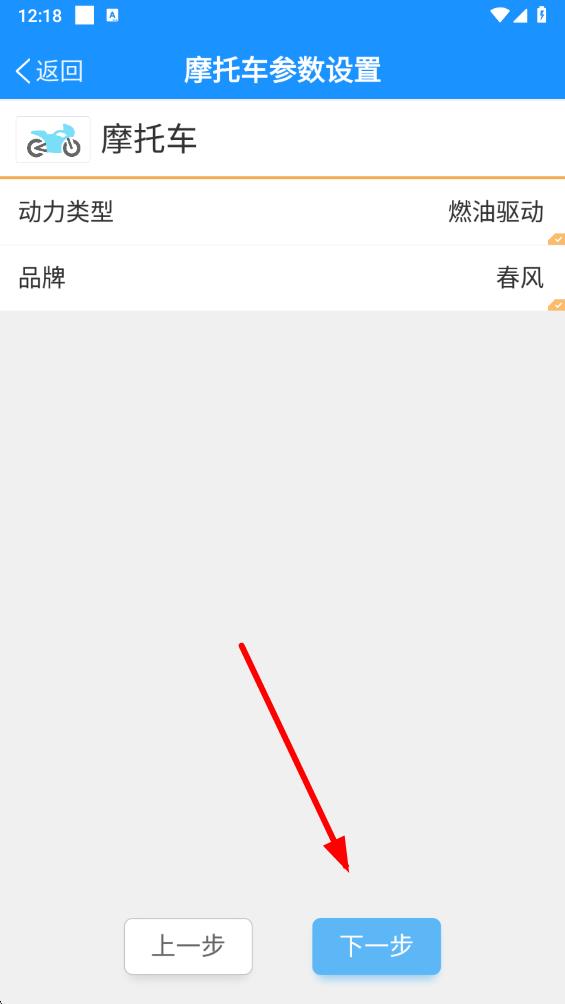 4、在車輛類型選擇頁(yè)面點(diǎn)擊摩托車,進(jìn)入摩托車參數(shù)設(shè)置界面。