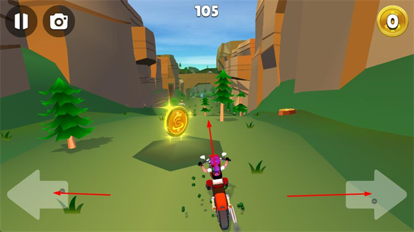 1、操控摩托在地形中行駛,收集金幣,同時注意躲避障礙物。