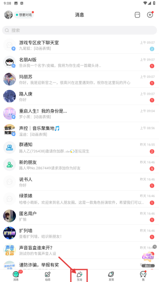 1、打開社交應(yīng)用,點(diǎn)擊底部互動(dòng)選項(xiàng),進(jìn)入互動(dòng)頁面。