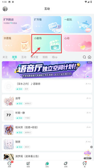 2、在互動(dòng)頁面,點(diǎn)擊小劇場(chǎng)選項(xiàng),進(jìn)入小劇場(chǎng)相關(guān)內(nèi)容區(qū)域。