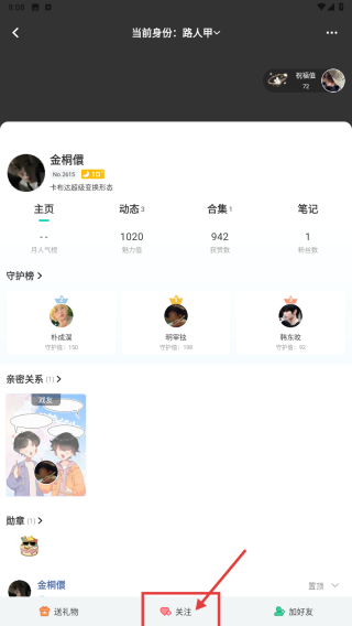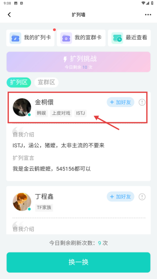 3、在小劇場(chǎng)區(qū)域,可瀏覽相關(guān)互動(dòng)內(nèi)容,也可返回互動(dòng)頁面點(diǎn)擊擴(kuò)列墻,找到金桐儇用戶,點(diǎn)擊加好友按鈕,進(jìn)行好友添加操作。