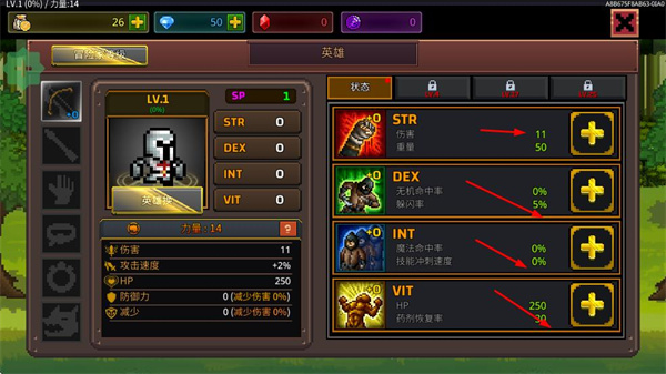 3、進(jìn)入英雄界面,點(diǎn)擊屬性旁的加號提升STR、DEX等屬性,增強(qiáng)角色戰(zhàn)力。