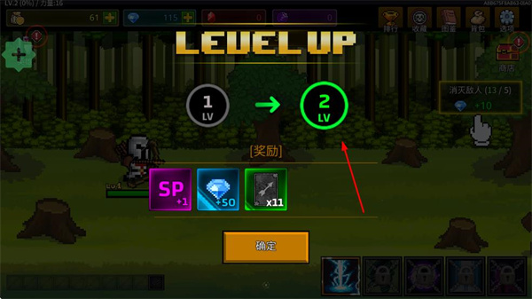 4、消滅敵人升級后,可獲得SP、鉆石、道具等獎(jiǎng)勵(lì),點(diǎn)擊確定領(lǐng)取,提升角色等級與實(shí)力。