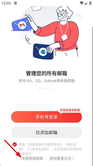 1、在APP登錄選擇頁面,點(diǎn)擊注冊網(wǎng)易郵箱,進(jìn)入郵箱選擇頁面。