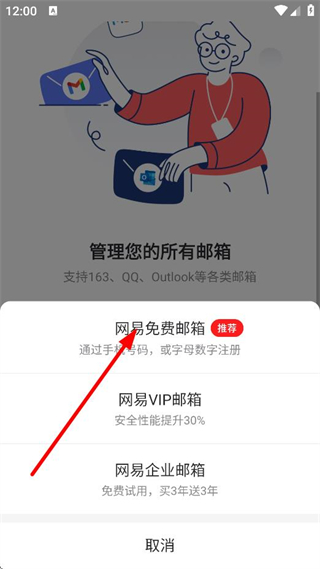 2、在郵箱選擇頁面,點(diǎn)擊網(wǎng)易免費(fèi)郵箱,進(jìn)入手機(jī)號快速注冊頁面。