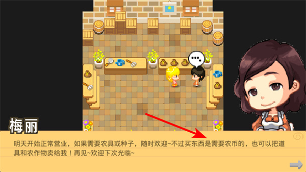4、與梅麗對話,了解商店的經(jīng)營規(guī)則,可在商店購買農(nóng)具、種子,出售道具和農(nóng)作物,實(shí)現(xiàn)增值。
