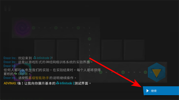 1、點(diǎn)擊繼續(xù)按鈕,推進(jìn)游戲教程或?qū)嶒?yàn)流程,了解游戲的神經(jīng)訓(xùn)練系統(tǒng)機(jī)制,開啟正式游戲環(huán)節(jié)。