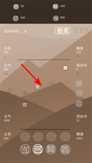 2、在戰(zhàn)斗界面中點擊對應兵種圖標,派遣士兵參戰(zhàn),根據(jù)兵種特性與戰(zhàn)場局勢合理排兵,提升戰(zhàn)斗勝率。