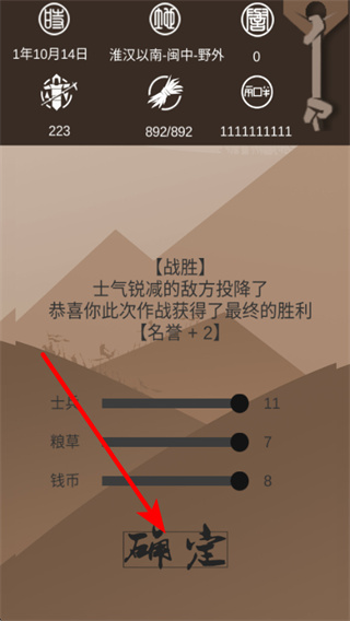 1、點擊確定按鈕,確認戰(zhàn)斗勝利結果,獲取名譽等獎勵,推進游戲進程,積累資源與聲望。