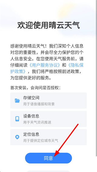 1、在歡迎使用晴云天氣彈窗中,點擊同意,進入添加城市頁面。