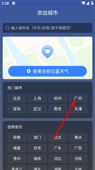 2、在添加城市頁面,選擇想要查看天氣的城市,進入該城市天氣頁面。