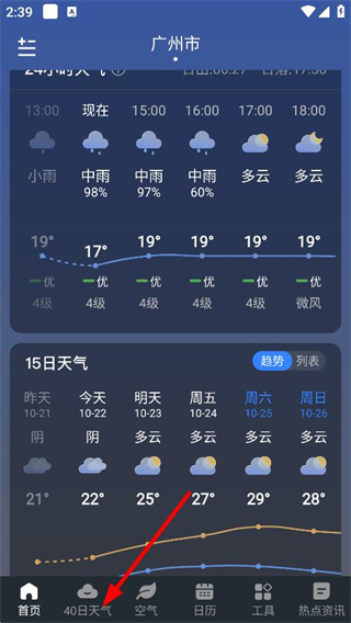 3、在城市天氣頁面,點擊底部40日天氣,進入40日天氣詳情頁面。