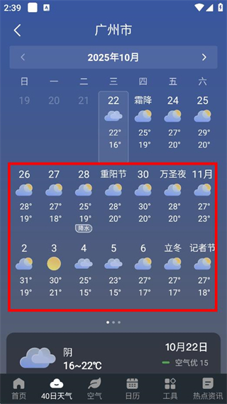 4、在40日天氣詳情頁面,可查看該城市未來40天的天氣情況,如溫度、天氣狀況等。