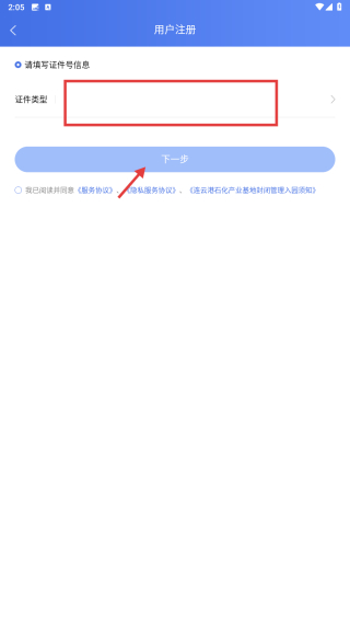 4、在用戶注冊(cè)頁(yè)面,選擇證件類型后點(diǎn)擊下一步,按提示完成賬號(hào)注冊(cè)操作。