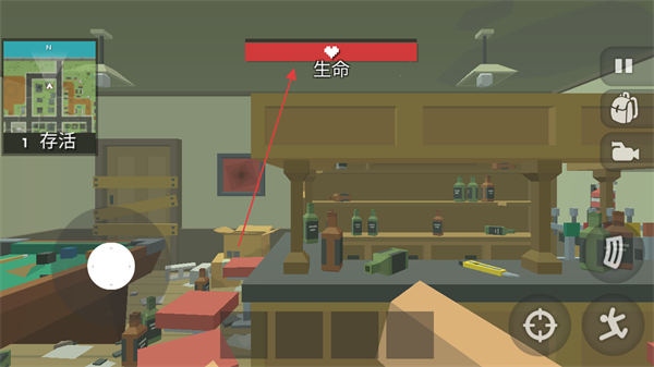 1、注意上方的生命條,在場(chǎng)景中搜索武器、道具,提升生存能力。