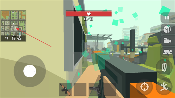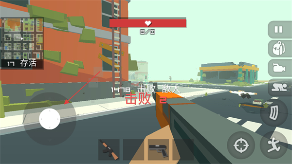 2、利用左側(cè)虛擬搖桿移動(dòng),瞄準(zhǔn)并擊敗其他敵人,減少存活人數(shù)。