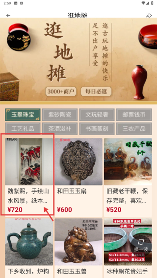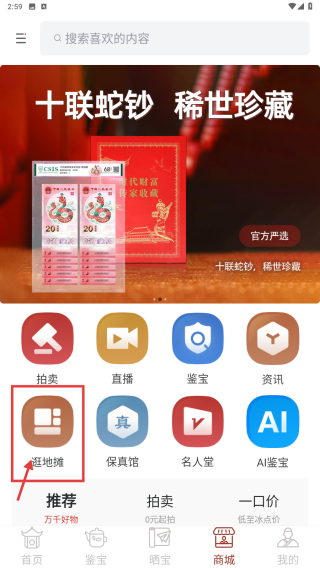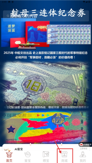 1、打開古玩交易應(yīng)用,點(diǎn)擊底部商城選項(xiàng),進(jìn)入商品商城頁(yè)面。