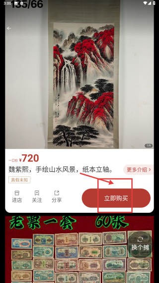 3、在地?cái)偵唐妨斜砝?,找到魏紫熙,手繪山水風(fēng)景,紙本立軸商品條目,點(diǎn)擊進(jìn)入商品詳情頁(yè)。