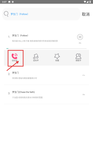 4、點(diǎn)擊設(shè)彩鈴即可將該歌曲設(shè)置為鈴聲。