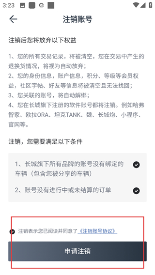 5、在注銷賬號(hào)頁(yè)面,勾選同意協(xié)議后點(diǎn)擊【申請(qǐng)注銷】可完成賬號(hào)注銷。