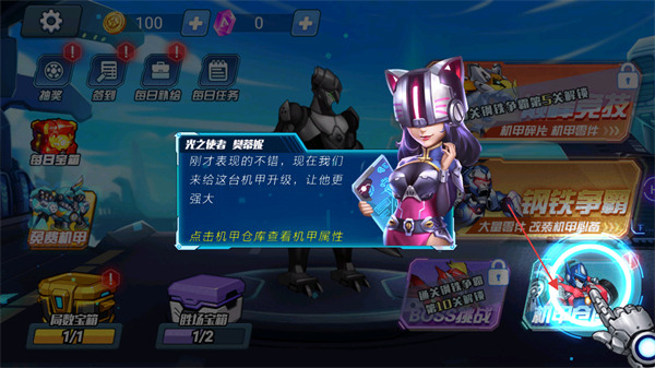 1、點(diǎn)擊機(jī)甲倉庫查看機(jī)甲屬性,進(jìn)行升級(jí)。