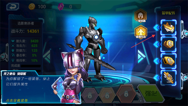 2、拖動(dòng)裝甲配件進(jìn)行穿戴,提升機(jī)甲攻擊屬性傷害。