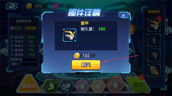 4、購買裝備部件進(jìn)行穿戴,提高機(jī)甲戰(zhàn)力屬性。