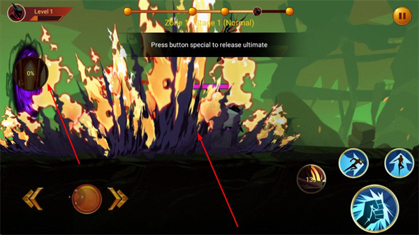 1、點(diǎn)擊特殊技能按鈕,釋放終極技能,對敵人造成大范圍傷害,提升戰(zhàn)斗效果。