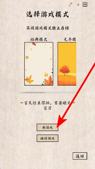 1、進(jìn)入游戲后選擇游戲模式,經(jīng)典模式需在一百天內(nèi)賺足一百萬,無盡模式可無限經(jīng)營(yíng),選擇后點(diǎn)擊新游戲開始創(chuàng)業(yè)旅程。
