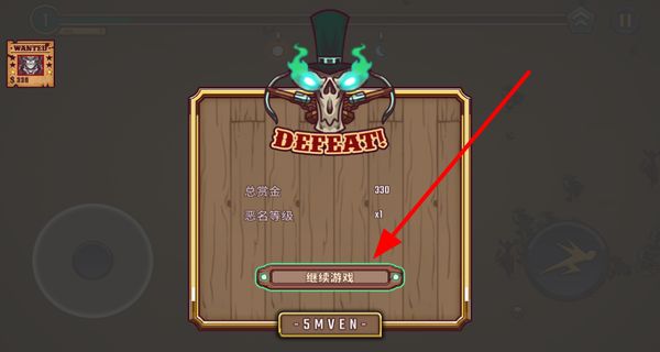 4、戰(zhàn)斗結(jié)束后,可點擊繼續(xù)游戲按鈕,繼續(xù)挑戰(zhàn)新的通緝目標,不斷積累賞金和提升惡名等級。