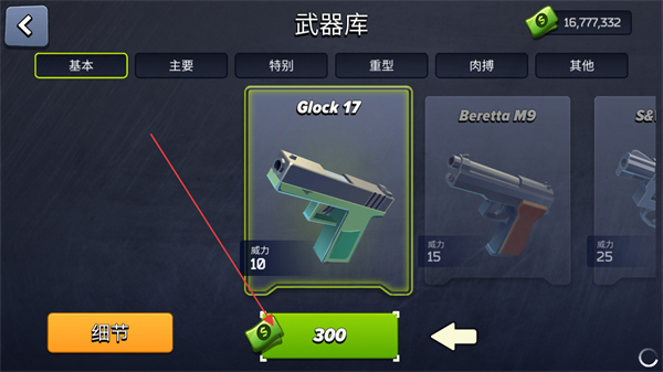 4、進(jìn)入武器庫(kù),花費(fèi)資源購(gòu)買Glock17等武器,增強(qiáng)火力,繼續(xù)突襲僵尸。