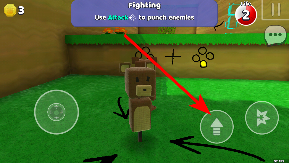 3、遇到紅色敵人時(shí),點(diǎn)擊右側(cè)星形攻擊按鈕,可讓小熊出拳攻擊敵人,擊敗敵人推進(jìn)冒險(xiǎn)進(jìn)程。