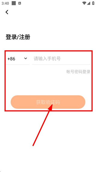 3、隨后我們可以在登錄/注冊頁面,輸入手機號,點擊獲取驗證碼。