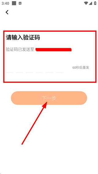 4、在驗證碼輸入頁面,輸入收到的驗證碼后,點擊下一步,完成賬號登錄或注冊。